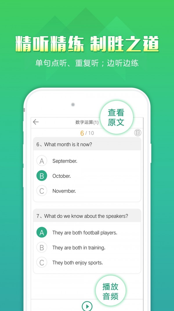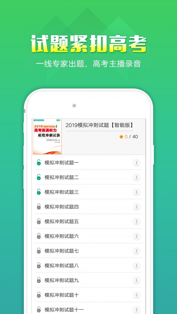 这款听力百分百app是高中英语听力自主学习神器,听力百分百app内题库为北大教授出题、高考主播录音原汁原味,听力百分百app支持人机交互、智能评测、随时随地练习,听力轻松提高。