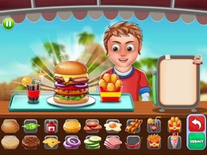 玩家将在游戏中制作汉堡,不同的汉堡,食材配料不一样,就像羊肉汉堡,鸡腿汉堡,他们的食材都不一样,玩家必须要在规定的时间内完成顾客的要求,否则顾客会溜走哦,食材也不能配错哦,不然要给差评了。