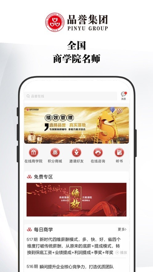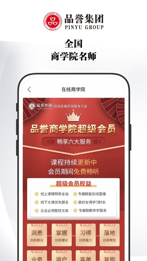 1.品誉商学院软件中有着很多知识价值体系化课程,随时都可以进行学习。